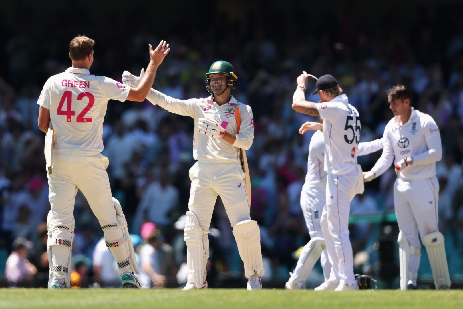 Mereka mendekat sebelum Usman Khawaja terpesona oleh Lidah, dan set Marnus Labuschagne habis setelah terjadi kesalahan dengan Alex Carey. Pada kedudukan 121-5, ada kemungkinan keruntuhan, tetapi Carey dan Cam Green menghilangkan ketakutan mereka, membuat tim mereka melewati batas dengan rekor 40 run yang tak terkalahkan.